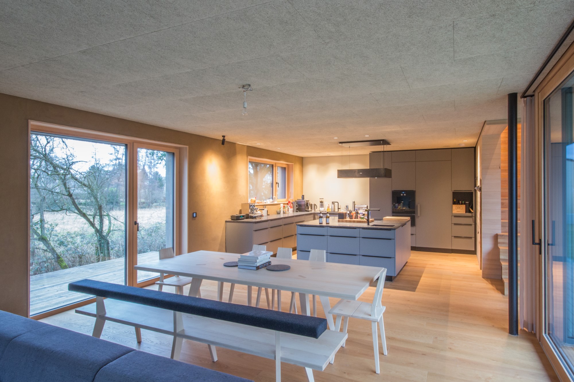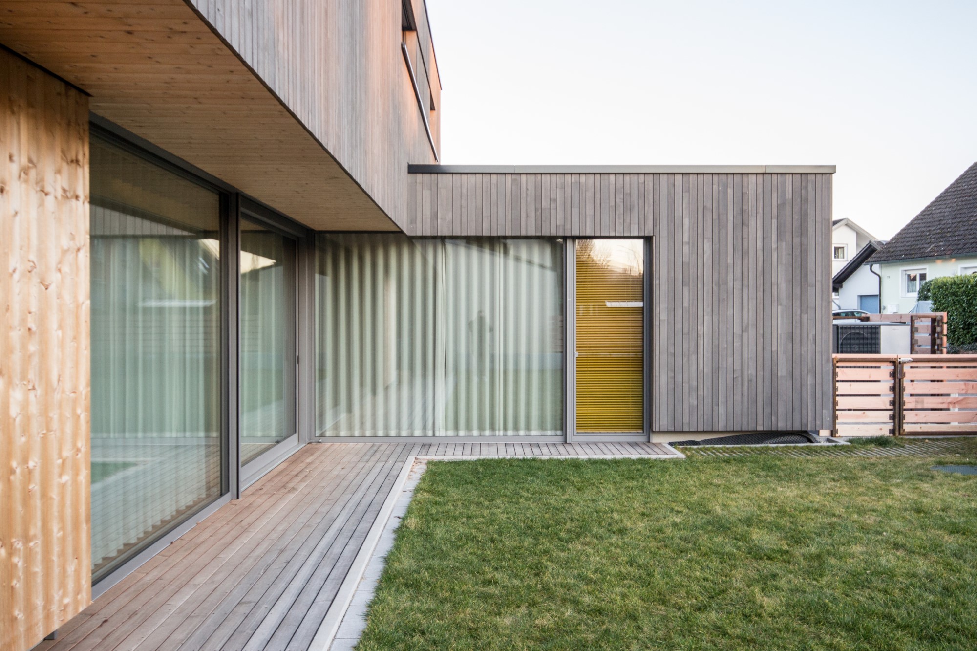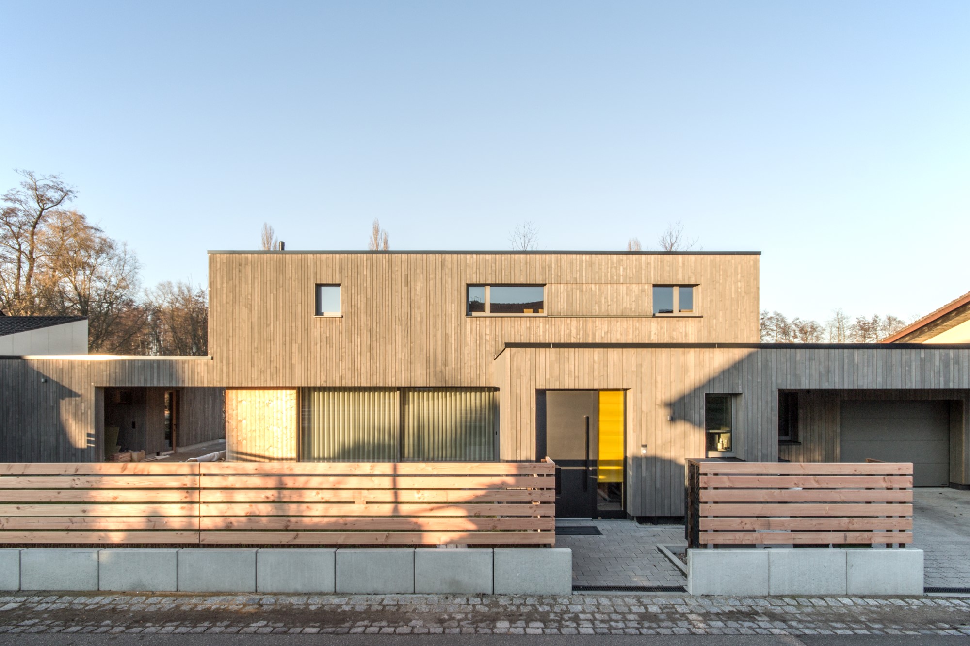 Der Neubau des Einfamilienhauses wurde als zukunftsweisendes Konzept gedacht und in nachhaltiger Holzmassivbauweise errichtet.Der Baustoff Holz findet sowohl als Konstruktions- wie auch als Gestaltungselement in der Holzfassade Verwendung.Das Gebäude verschmilzt optisch mit den Nebengebäuden, welche Garage und Saunahaus beinhalten, zu einer Einheit.Auch im Innenausbau wurde Wert auf die Verwendung ökologischer und wohngesunder Materialien gelegt.Die Innenwände wurden mit Lehm verputzt und in Teilbereichen mit unbehandeltem Weißtannenholz verkleidet.Große Fensterflächen verbinden den Wohnraum mit dem Garten und angrenzenden Naturschutzgebiet.