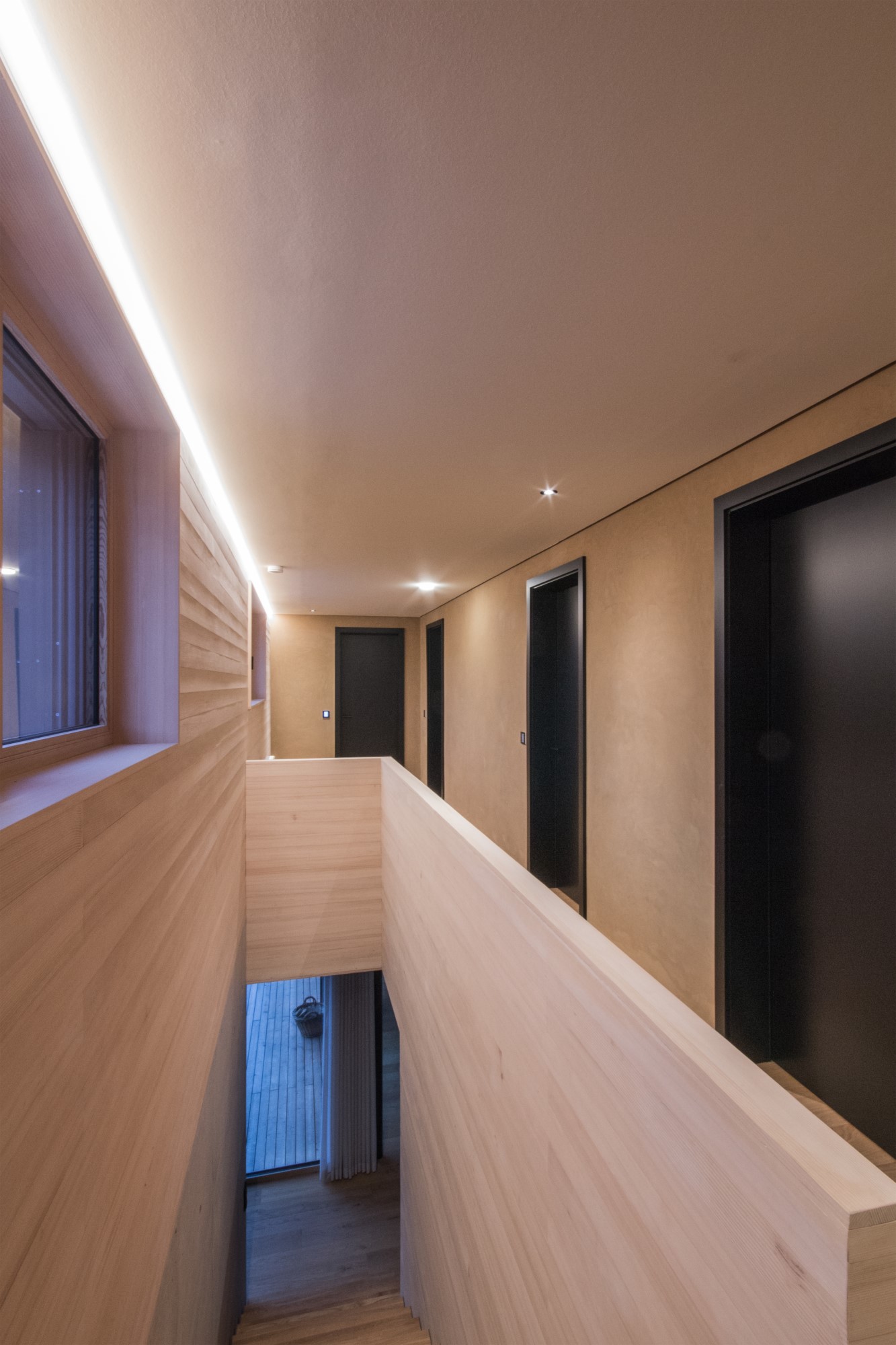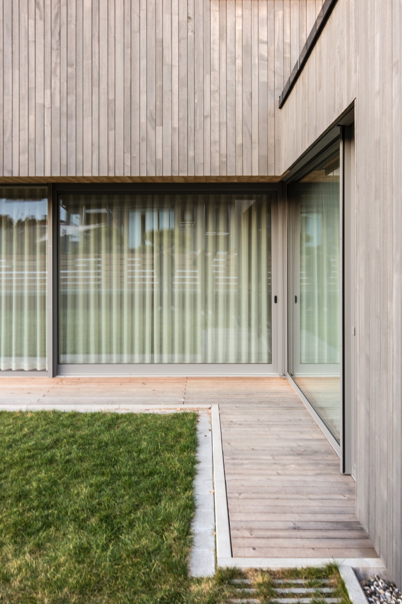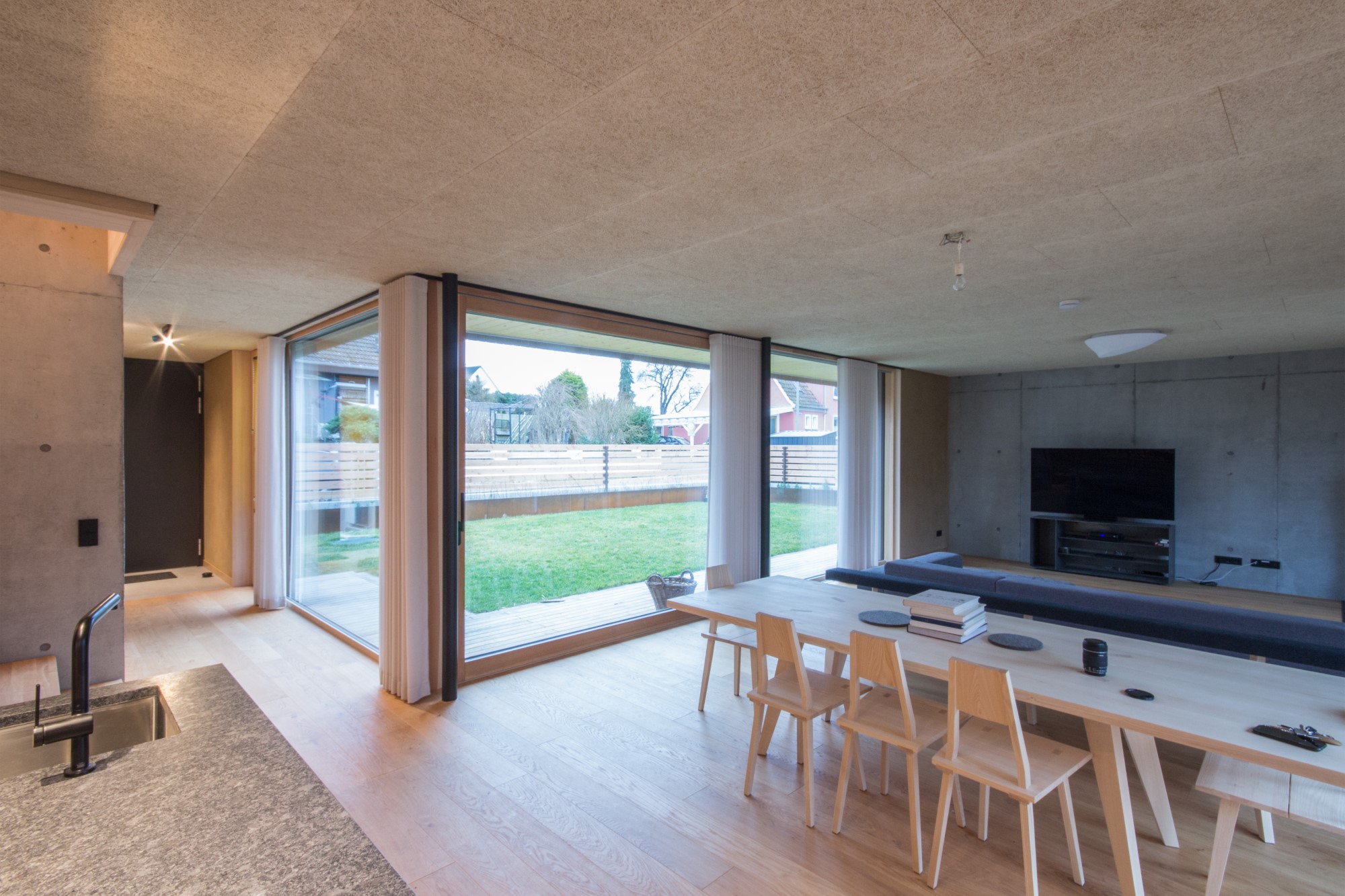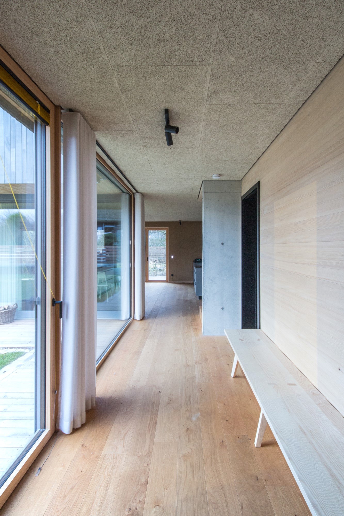 Der Neubau des Einfamilienhauses wurde als zukunftsweisendes Konzept gedacht und in nachhaltiger Holzmassivbauweise errichtet.Der Baustoff Holz findet sowohl als Konstruktions- wie auch als Gestaltungselement in der Holzfassade Verwendung.Das Gebäude verschmilzt optisch mit den Nebengebäuden, welche Garage und Saunahaus beinhalten, zu einer Einheit.Auch im Innenausbau wurde Wert auf die Verwendung ökologischer und wohngesunder Materialien gelegt.Die Innenwände wurden mit Lehm verputzt und in Teilbereichen mit unbehandeltem Weißtannenholz verkleidet.Große Fensterflächen verbinden den Wohnraum mit dem Garten und angrenzenden Naturschutzgebiet.